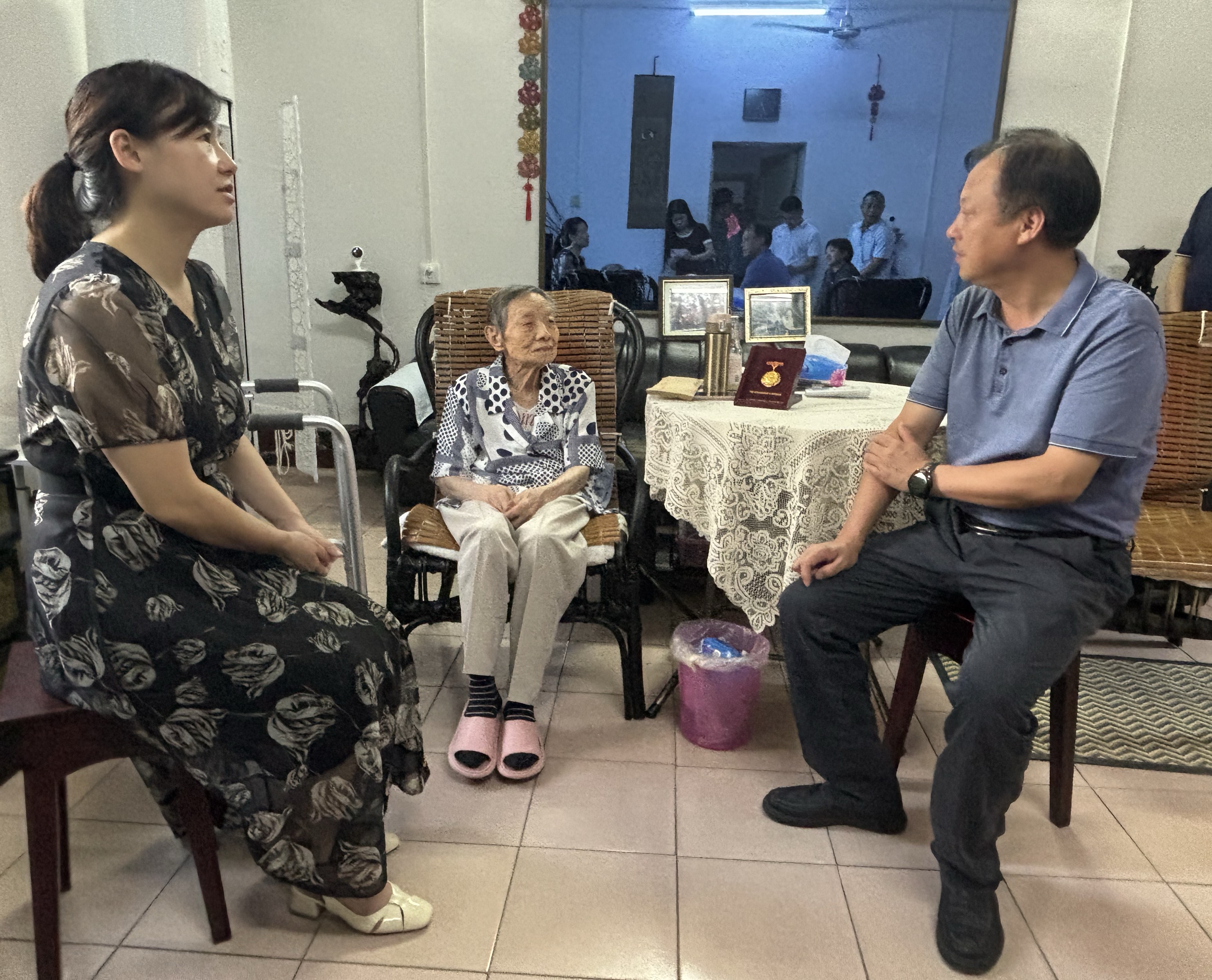 慰问组与刘同和同志遗孀亲切交谈,细致入微地询问她的身体健康状况、生活起居是否存在困难以及子女生活情况。大家共同追忆了刘同和同志在民族危亡之际献身革命、艰苦奋斗、勤恳工作的光辉岁月,感念他为地方发展所作出的重要贡献。活动中,慰问组代表党和政府向家属们致以崇高敬意和诚挚问候,并郑重送上“中国人民抗日战争胜利80周年”纪念章、慰问金及慰问品。